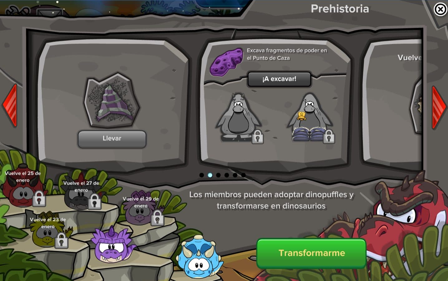¡SALIR DE MAPA!, ¡IR A PIEDRA DE METEORO!, estar en esquina arriba derecha. Piedra dar objetos varios días para todos. Presionar botón ''¡A EXCAVAR!'' para jugar Busca Dinos varios días. Busca Dinos dar premios. Piedra ofrece DINOPUFFLES Y SER DINOSAURIOS EN ''TRANSFORMARME'' SOLO MIEMBROS, ¡UNGO UNGO UH!