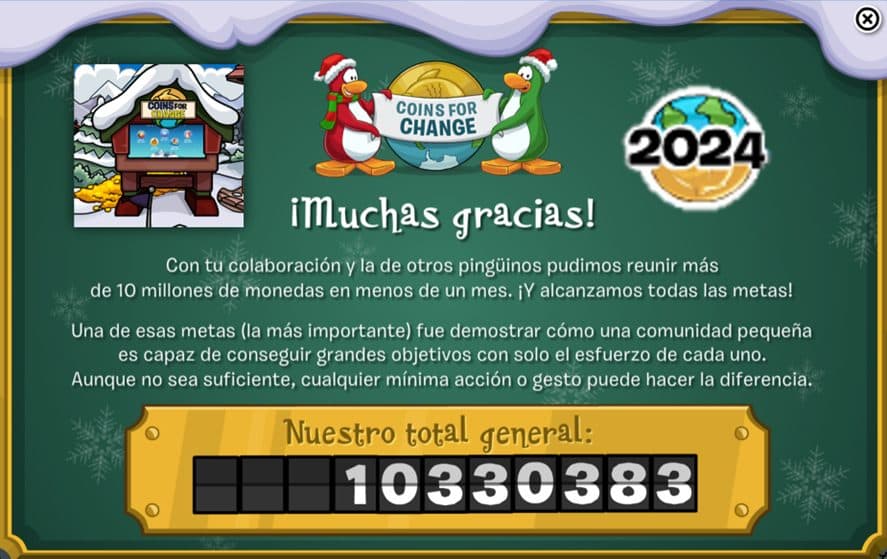 Pasando al Fuerte Nevado, y antes de continuar con nuestra exploración, tenemos un gran afiche sobre los resultados de Coins For Change 2024 a la izquierda de la Torre del Reloj. Solo quiero agradecerles en nombre de todo el equipo de FluffyPenguin por todas las donaciones hechas a esta campaña, han demostrado el compromiso durante las fiestas y esperamos que se repita pronto.